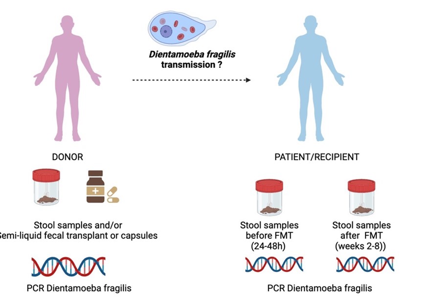 This study will be conducted on healthy volunteers selected as donors for fecal microbiota transplantation, as well as on the transplants and recipients treated with FMT. The presence of Dientamoeba fragilis will be investigated through – real-time PCR in frozen (-80°C) fecal samples from both donors and recipients, as well as on the transplants (semi-liquid or capsules). A standardized clinical follow-up of patients is conducted as part of routine care to monitor all post-transplantation adverse effects, with follow-ups at day 15 and week 8 (figure).