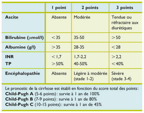 La classification de Child-Turcotte-Pugh, appelée plus couramment le score de Child-Pugh est basée sur 5 paramètres : la bilirubine, l'albumine, le temps de prothrombine (TP), l'ascite et l'encéphalopathie. Le tableau ci-dessous détaille la manière de calculer le score.