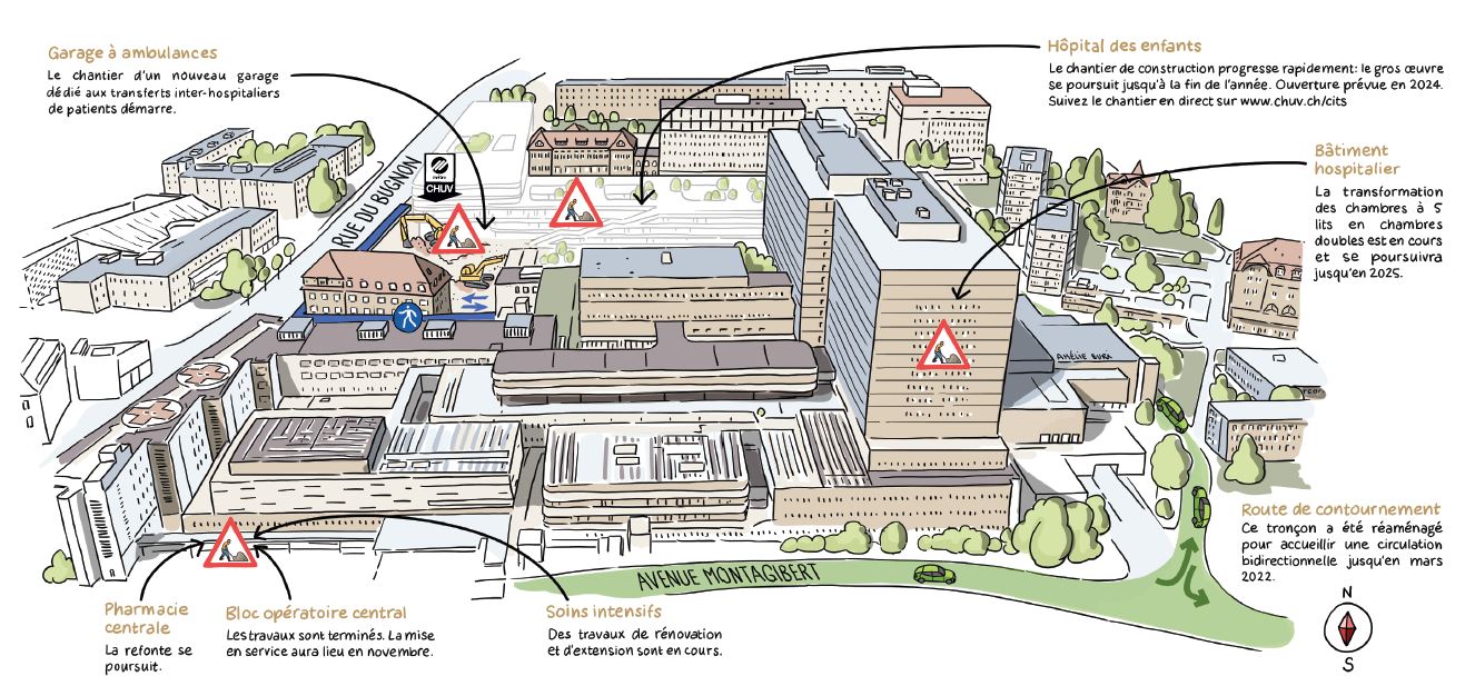 D'autres chantiers dans l'agglomération lausannoise peuvent momentanément ralentir et rendre difficile les accès au CHUV.