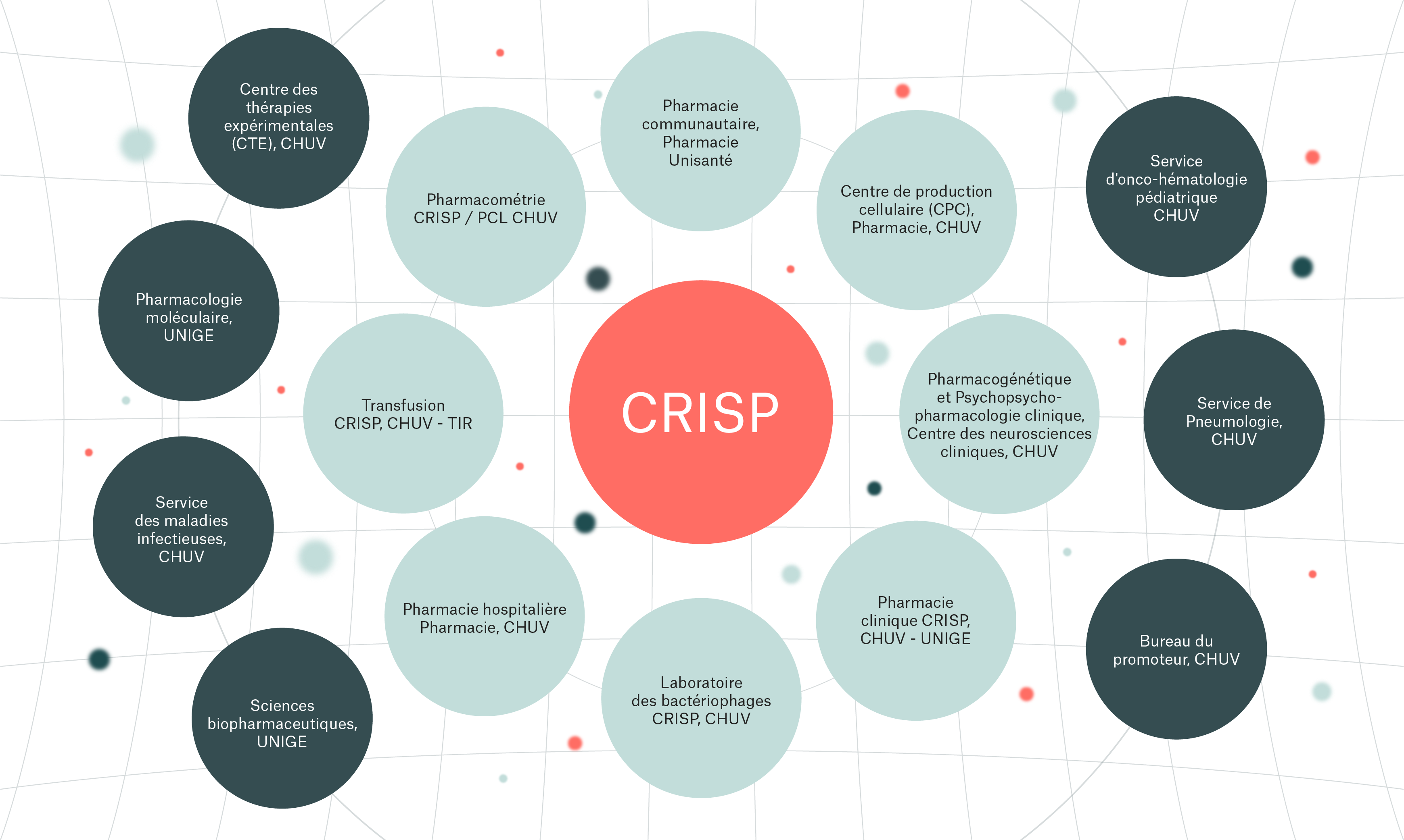 Le CRISP met en réseau des groupes académiques du CHUV, d’Unisanté et de la Section des Sciences pharmaceutiques de l'Université de Genève autours de trois pôles de compétences «Médicaments en vie réelle», «Thérapies innovantes biologiques et cellulaires ATMP» et «Pharmacie digitale» qui travaillent en synergie afin d’améliorer la cohérence et l’efficience de la recherche et de la translation des résultats dans les soins, de pérenniser et de renforcer l’enseignement des sciences pharmaceutiques cliniques touchant aux thérapies usuelles ou issues du monde biologique et cellulaire.