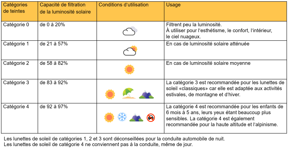 Il est important de choisir une paire de lunettes de soleil adaptée à son activité. Il existe actuellement 5 catégories de protection solaire, allant dans un ordre croissant de 0 à 4. Plus la catégorie est élevée, plus les verres sont capables de bien filtrer la luminosité solaire ambiante. Cette information se trouve sur la branche intérieure des lunettes, vous pouvez en discuter avec votre opticien. Il est toujours préférable d’opter pour des lunettes certifiées CE car c’est l’assurance qu’elles respectent bien ces catégories. La mention UV400 est un indice supplémentaire des catégories de protection. Il signifie qu’en plus du pourcentage de lumière filtrée par les verres, ceux-ci sont capable d’arrêter entre 99% et 100% des rayons UVA et UVB.