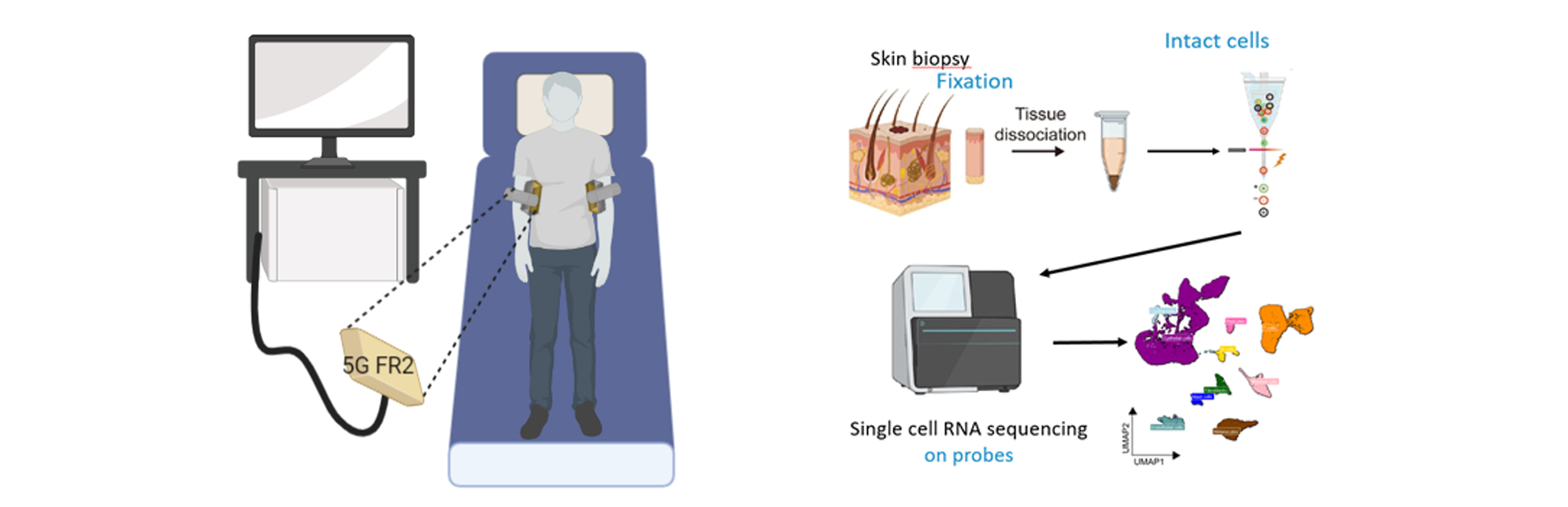 Our aim is to understand the effects of 5G waves on skin by performing a clinical trial. In this study, participants (healthy volunteers, patients with dermatoporosis, or whose skin is prone to developing cancer or who suffer from atopic dermatitis) will be exposed to carefully chosen 5G parameters and skin will be analyzed by state-of-the-art single cell RNA analysis (an unbiased and very sensitive technique ideal for studying cell behavior changes). This project will also decipher the differences between women and men, in response to 5G FR2 waves.
