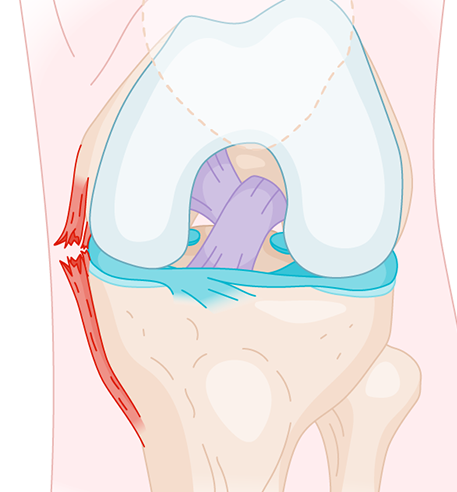 La lésion du LCI est fréquente chez l’enfant et le jeune adolescent. Il s’agit généralement d’un étirement plus ou moins important du ligament, la rupture complète (schéma B) étant très rare pour cette tranche d’âge.