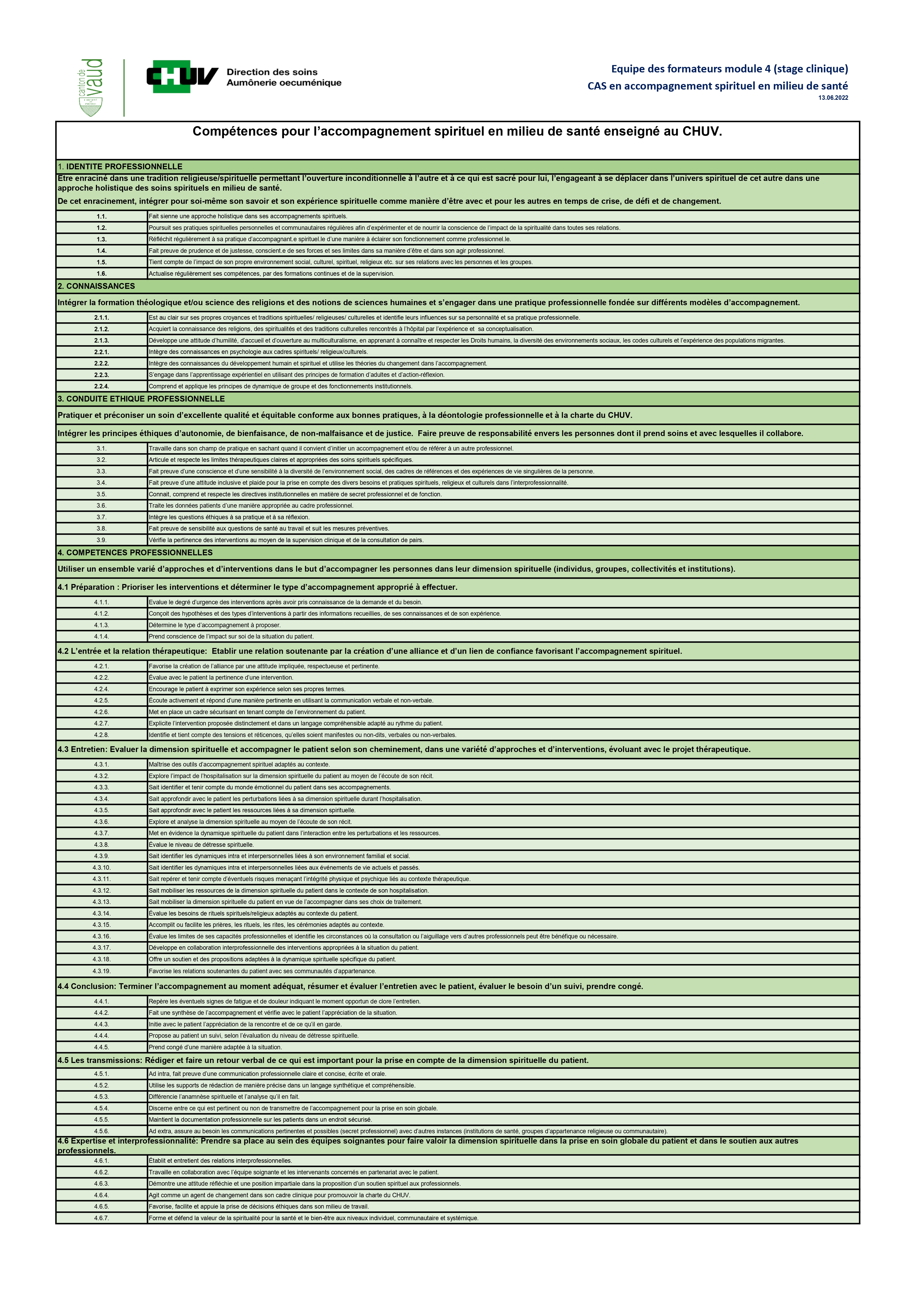 L’orientation de la formation vise au développement d’une meilleure prise en charge de la dimension spirituelle de la personne hospitalisée. L’amélioration des compétences est donc au centre notre intérêt et ce dans un service d’aumônerie qui fait preuve de cohérence professionnelle. Ces compétences vécues dans la cohérence apportent une efficience d’actions et des effets démontrant ainsi la pertinence des soins spirituels auprès des malades, des autres professionnels, du CHUV et des Institutions partenaires (Université, Églises, etc.)