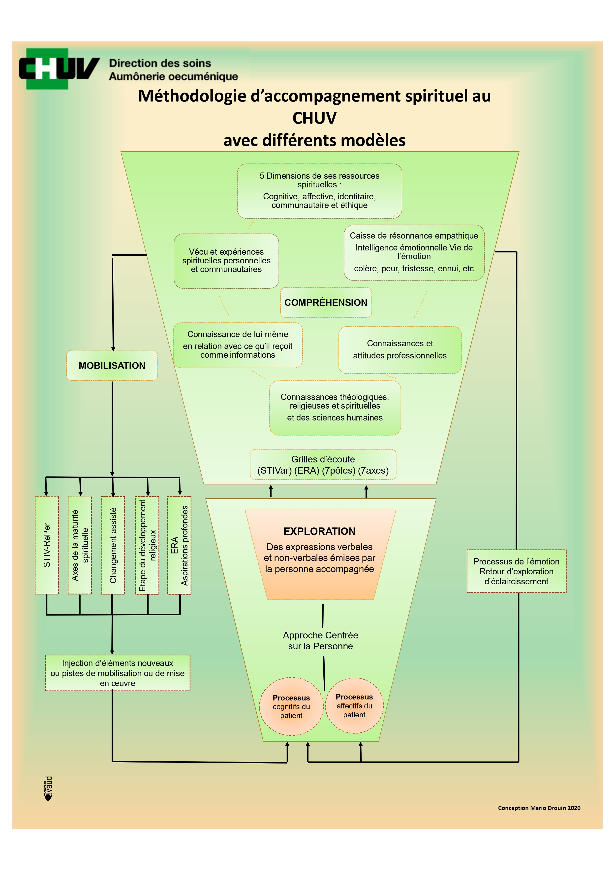 - Mettre à jour et rehausser les compétences et les pratiques des accompagnants-es spirituels-les, des superviseurs-es et du personnel soignant du CHUV en favorisant une vision, une pratique et un langage commun du spirituel.