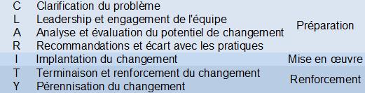 Pour structurer nos projets de transferts de savoirs dans les pratiques de soins, nous avons choisi le modèle CLARITY, un modèle conçu et diffusé par le JBI Il offre une approche du transfert des connaissances dans la pratique aidante pour les professionnels et s’inspire de neuf modèles dominants dans la science de l’implantation (School of Translational Health Science and JBI, 2013).