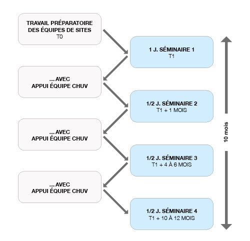 Elle suit une formation composée de 4 séminaires (1 jour et 3 demi-jours), déployés sur une durée d’environ 10 mois. Ces sessions alternent avec des périodes pendant lesquelles elle met en pratique les enseignements reçus et implémente, dans son unité, le programme ERAS. Elle reçoit, durant ce temps, un coaching et des conseils personnalisés pour parfaire ses résultats.