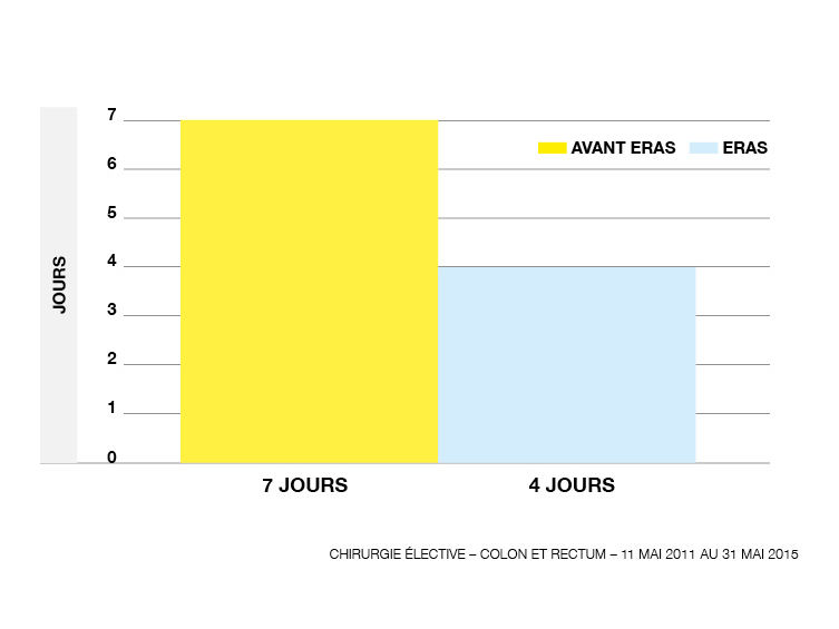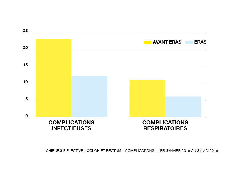 A ce jour, environ 900 patient-e-s ont bénéficié d’une prise en charge ERAS au CHUV pour la chirurgie colorectale, avec une diminution des complications postopératoires de 50% et une réduction de la durée moyenne de séjour de 2 à 3 jours
