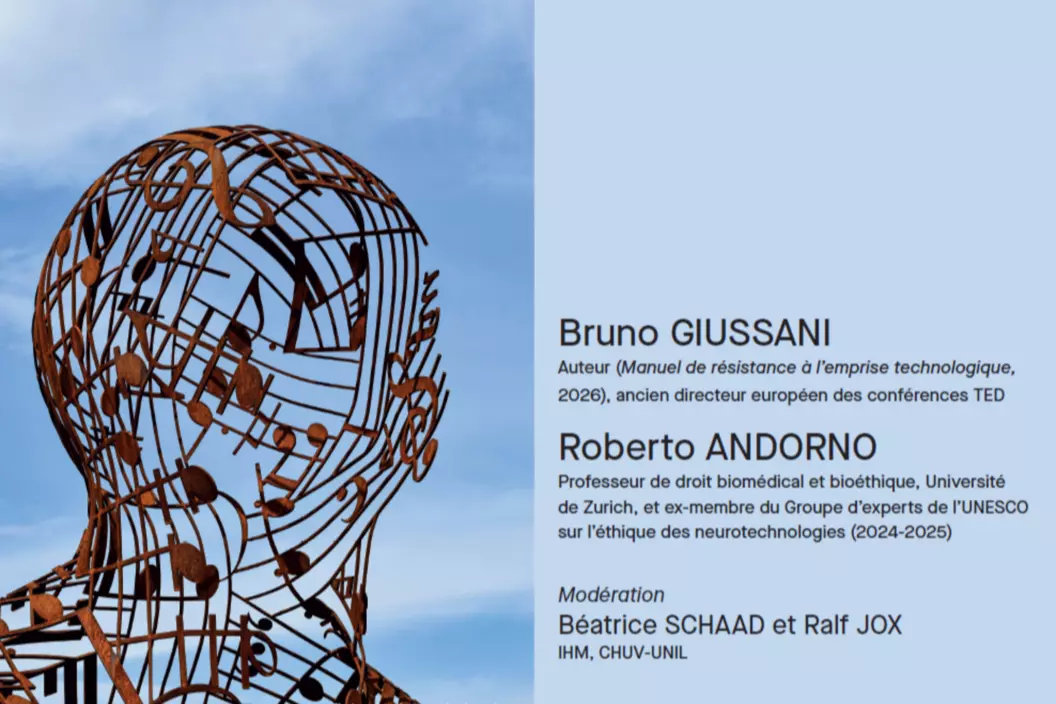 L'Institut des humanités en médecine CHUV-UNIL vous convie à une soirée avec Bruno Giussani et Roberto Andorno sur "L'intelligence artificielle, les neurotechnologies et l'intégrité cognitive : comprendre les nouveaux enjeux éthiques et sociaux"