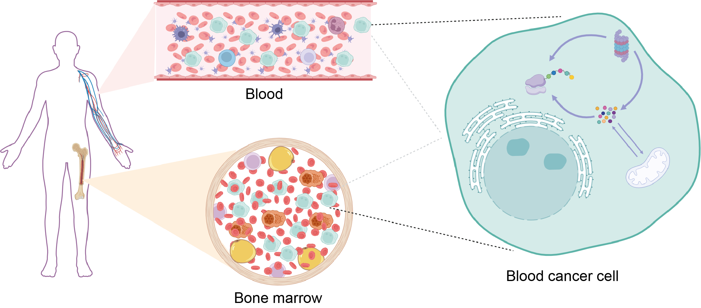 Our team investigates protein homeostasis, or “proteostasis”, in blood cancer cells. Proteostasis is a prerequisite for the functioning of cells and requires a finely tuned regulation of protein synthesis and degradation. This tightly controlled balance maintains the cellular proteome, the set of proteins in a cell, which is often disrupted in cancer. By understanding how proteostasis mechanisms in cancer cells differ from those in healthy cells, we can identify vulnerabilities in cancer cells that can be targeted by new therapies.