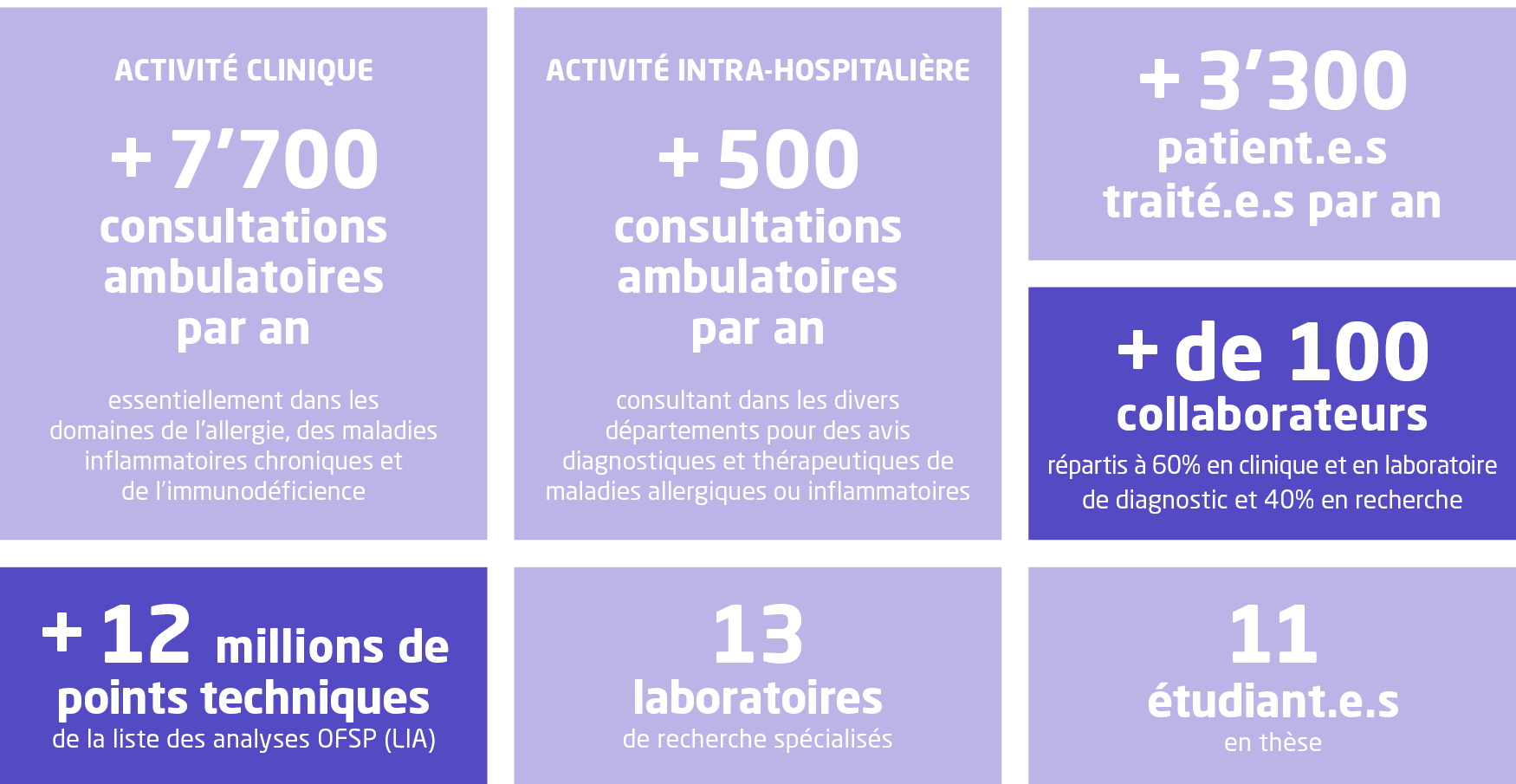 Notre laboratoire de diagnostic est accrédité selon la norme ISO/CEI 17025. Ses principales activités concernent les domaines de la vaccinologie, l’autoimmunité, les allergies, l’inflammation, les immunodéficiences, le dépistage et le suivi du VIH, les hépatites virales ainsi que la caractérisation des gammapathies et la transplantation d’organes. Depuis 2022, il développe de nouvelles analyses médico-techniques pour les patients immunosupprimés dans le cadre d’effets indésirables induits par le traitement du cancer par immunothérapie.