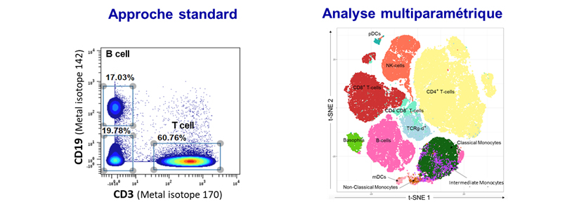 Ces caractéristiques permettent de mesurer plus de 50 paramètres simultanément sans qu'il soit nécessaire de compenser entre les différents anticorps à couplage métallique. Le marquage des cellules avec ces anticorps CyTOF montre d'excellentes corrélations dans les études de validation croisée réalisées avec des anticorps marqués par fluorescence et analysés par cytométrie en flux (Figure 2).