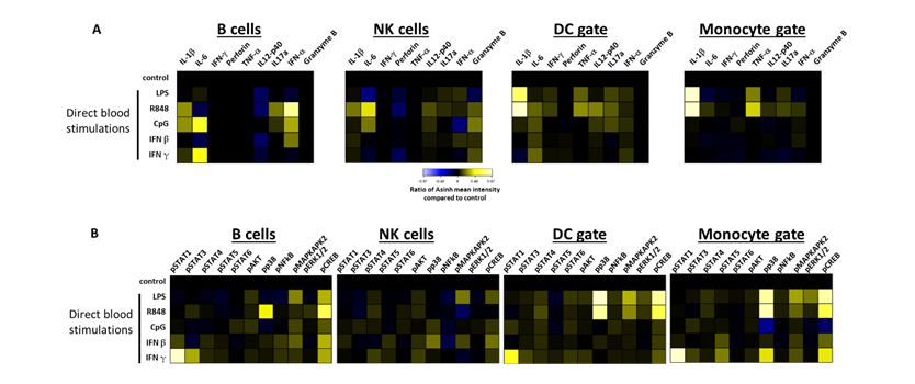 L'analyse des échantillons de sang par cytométrie de masse permet une caractérisation phénotypique simultanée de presque toutes les populations de cellules immunitaires. Le laboratoire de diagnostic utilise ces profils pour identifier les anomalies dans les populations de cellules immunitaires d'un patient par rapport aux normes d'individus sains. Ces analyses peuvent être réalisées par des approches de gating standard et également à l'aide de logiciels d'analyse non supervisée tels que t-SNE qui sépare automatiquement les cellules en populations sur la base de leurs caractéristiques phénotypiques (Figure 3). En plus de la caractérisation phénotypique, les panels de cytométrie de masse sont utilisés pour évaluer l'activité fonctionnelle des populations de cellules immunitaires adaptatives et innées en mesurant les niveaux intracellulaires de différentes cytokines ou protéines cytotoxiques (Figure 4A). De la même manière, la cytométrie de masse peut également être utilisée pour évaluer les événements de signalisation liés à l'immunité en surveillant les niveaux de phosphorylation de jusqu'à onze protéines de signalisation différentes (Figure 4B).