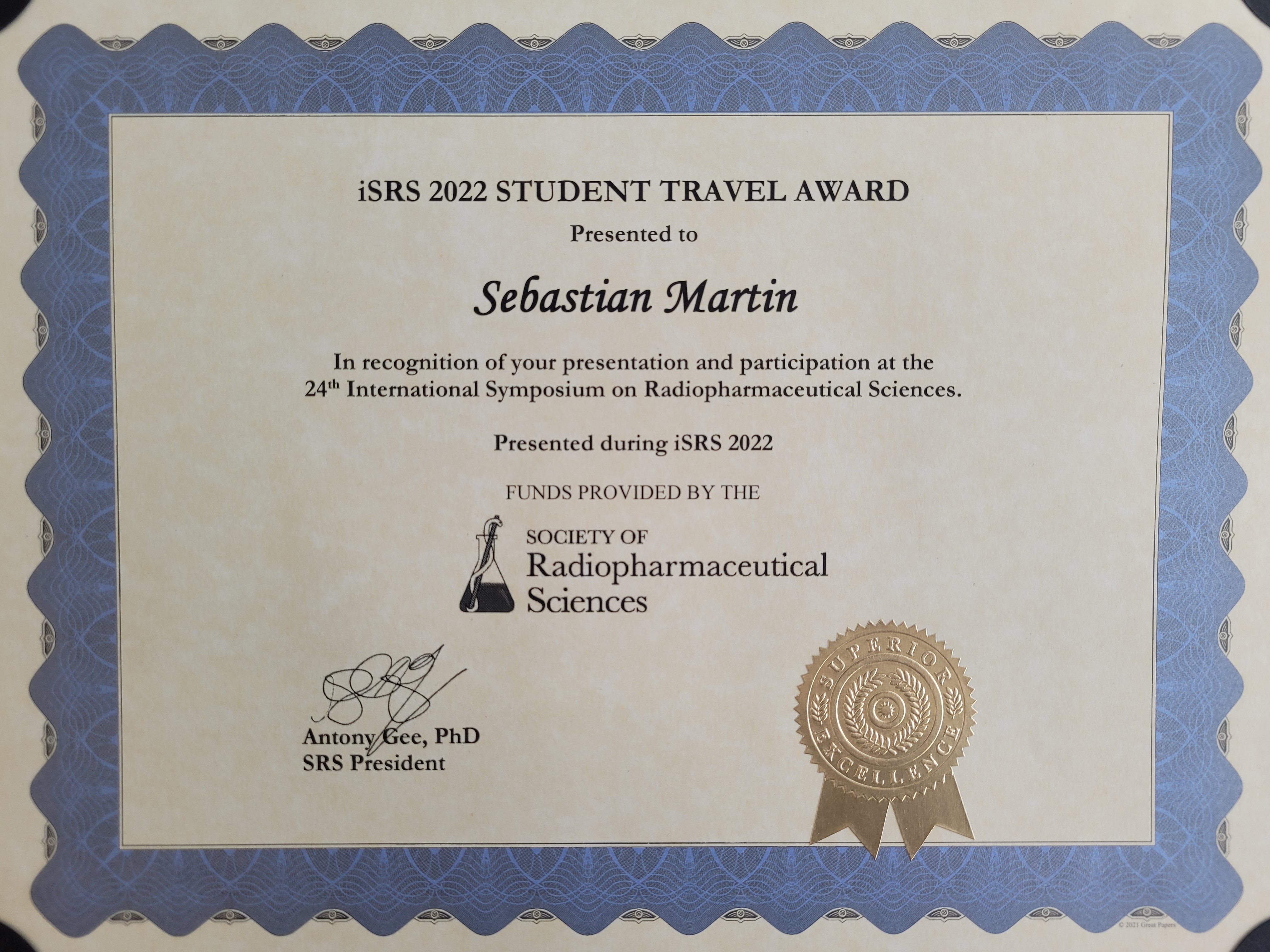 We congratulate our PhD student Sebastian for his travel award and his talk at the iSRS2022 symposium in Nantes.