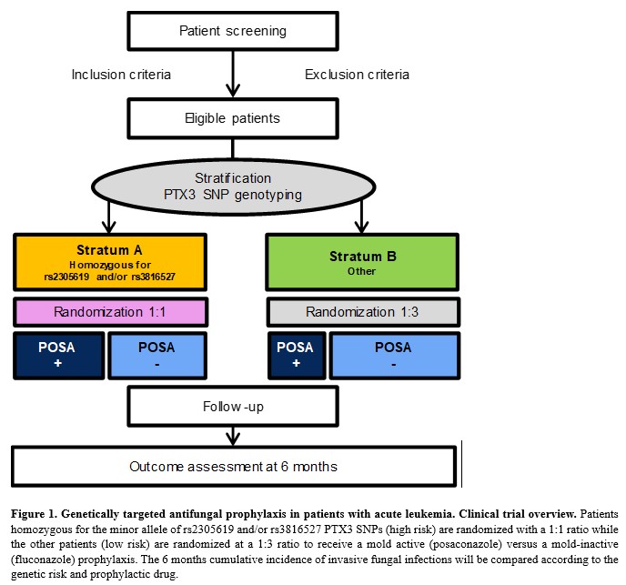 Through a SNF funding (IICT), we are currently performing “real life” PTX3 genotyping to optimize the use of antifungals in the prophylaxis of patient with acute leukemia. Genetic testing is performed in our lab for patients diagnosed with acute leukemia and prophylaxis during chemotherapy-induced neutropenia is determined according to PTX3 genotypes rs2305619 and/or rs3816527. This approach could provide a rationale for antifungal prophylaxis in leukemia patients, by limiting the use of broad-spectrum agents to high-risk patients, while avoiding their unnecessary side effects, costs and emergence of resistance in the other patients.