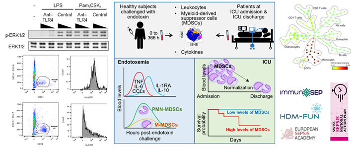Combining preclinical mouse models of sepsis with clinical studies, we contribute to the understanding of host defense mechanisms and the pathophysiology of sepsis and the identification of sepsis biomarkers (such as the myeloid-derived suppressors cells, MDSCs). In a proof-of-concept study, we have demonstrated the feasibility to target innate immune receptors (i.e. Toll-like receptor 4) to combat sepsis. In Switzerland, we launched the Swiss Sepsis National Action Plan (SSNAP; see www.sgi-ssmi.ch/fr/news-detail/items/plan-daction-national-suisse-contre-sepsis.html) to raise awareness of sepsis among the general public and governing bodies. With European collaborators, we have set up the European Sepsis Academy (EU H2020 funding) to train a generation of young scientist and physicians in sepsis. As a culmination of years of research, we are running the H2020 ImmunoSep (https://www.immunosep.eu) and H2020 HDM-FUN (https://www.hdm-fun.eu) clinical trials applying personalized immunotherapy in sepsis and fungal infection.