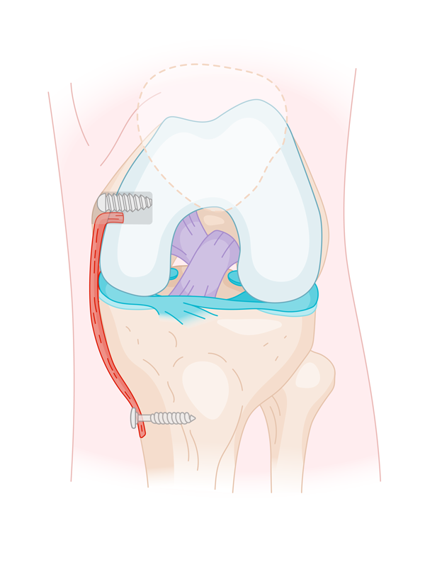 fig. 6 : ligament collatéral interne après réparation chirurgicale : en rouge, greffe du ligament fixée par deux vis progressivement résorbables