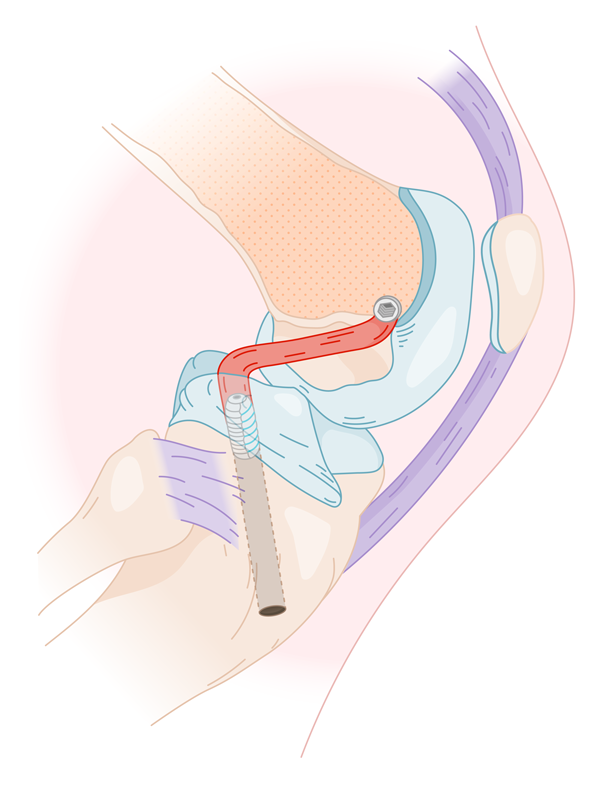 fig. 8 : ligament croisé postérieur après reconstruction chirurgicale : le ligament est remplacé par une greffe stabilisée par des vis progressivement résorbables