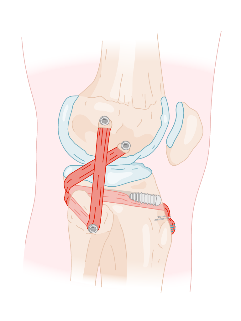 fig. 11 : point d'angle postéro-externe après réapration chirurgicale : ici, 3 ligaments ont été remplacés par des greffes stabilisées par des vis progressivement résorbables