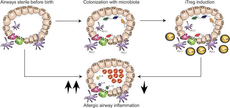 Nous étudions les mécanismes par lesquels le système immunitaire mûrit pendant la période périnatale. L'accent est mis sur la manière dont les expositions environnementales (prénatales ou postnatales) influencent ce processus de développement et sur les conséquences de ces environnements sur la susceptibilité aux maladies respiratoires à l'âge adulte. (Gollwitzer et coll.).