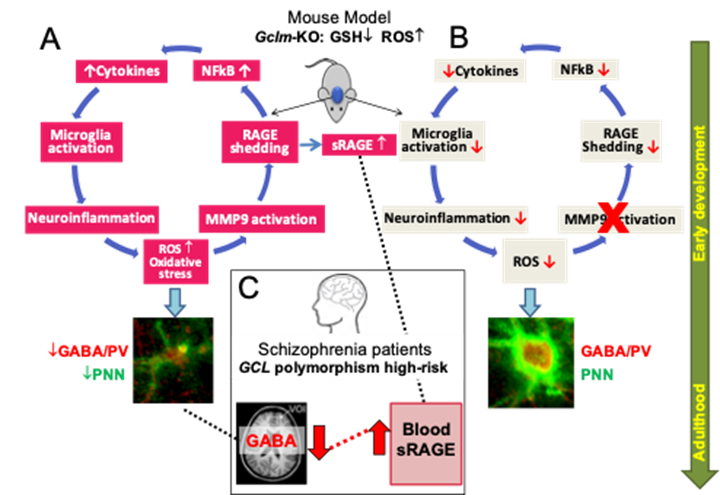 Le mécanisme de MMP9/RAGE s'est avéré pertinent pour la schizophrénie, car les niveaux de RAGE mesurés dans le sang des patients dans la phase précoce de psychose étaient augmentés et étaient associés à un niveau diminué de GABA dans le cortex préfrontal. Ces anomalies ont pu être amélioré par une supplémentation d’un antioxydant pendant 6 mois (Dwir et al., Mol Psy 2019;Dwir et al., SZ Bulletin 2021). De plus, l’activité de MMP9 mesuré dans le sang des patients dans la phase précoce de psychose était associée à une mesure d’imagerie cérébrale par résonance magnétique pouvant potentiellement refléter la neuroinflammation dans l'hippocampe (Seitz-Holland et al., under revision).