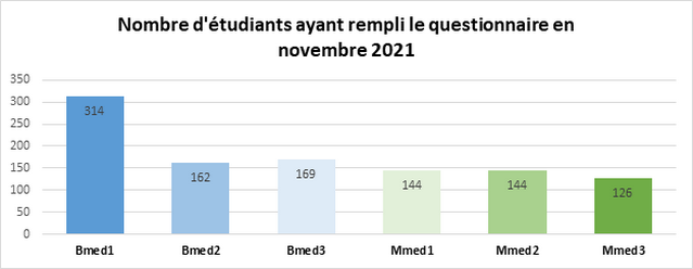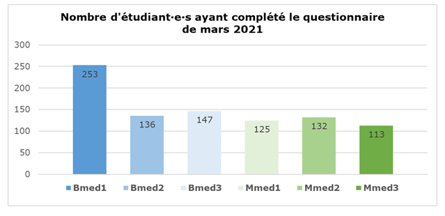 La première collecte de données du projet ETMED-L a eu lieu entre le 5 mars et le 5 avril 2021. Parmi les 1793 étudiant·e·s à qui le questionnaire a été envoyé, 937 (52%) ont participé à l’étude et 906 (50%) ont complété l’entier du questionnaire. Ce taux de réponse élevé et la bonne représentation des différentes années académiques permettront des analyses de qualité et faciliteront l’étude de trajectoires longitudinales.