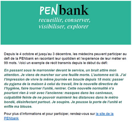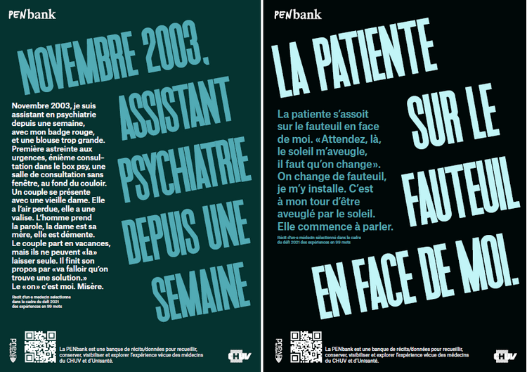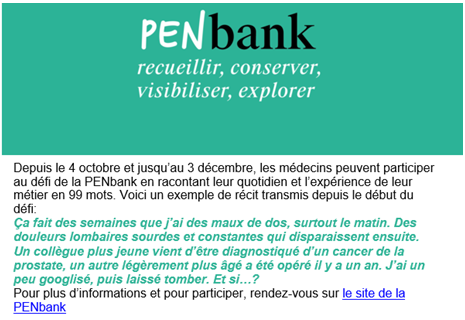 Trois récits ont été sélectionnés par un jury suite au défi lancé aux médecins de raconter leurs expériences en 99 mots pour le lancement de la PEnbank (octobre – décembre 2021). Les trois gagnants ont été affichés sur le site de la cité hospitalière au mois de juin 2022.