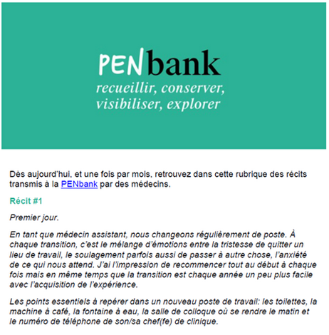 La PENbank est une infrastructure innovante qui a pour but de collecter, conserver, donner à voir et rendre disponible l’expérience vécue de la population médicale du CHUV et d’Unisanté. Autrement dit, la PENbank est une banque de récits d’expériences qui permet, au travers des récits, de documenter un monde, celui des médecins et de leur pratique quotidienne de la médecine.