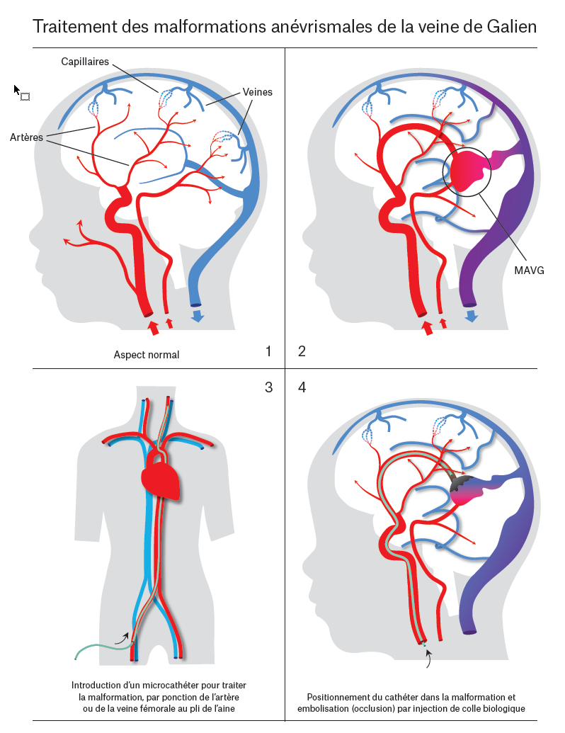 La malformation anévrismale de la veine de Galien touche le réseau capillaire se jetant dans la veine de Galien (figure 2). Ces vaisseaux, malformés et dilatés (anévrisme), entraînent un court-circuit entre les artères et les veines situées dans la partie centrale du cerveau. Cette malformation se forme avant la naissance mais elle n’est dépistée que chez la moitié des foetus. Elle a pour conséquence une augmentation importante du débit et de la pression dans les veines de la malformation et du cerveau. Les éventuels symptômes sont :