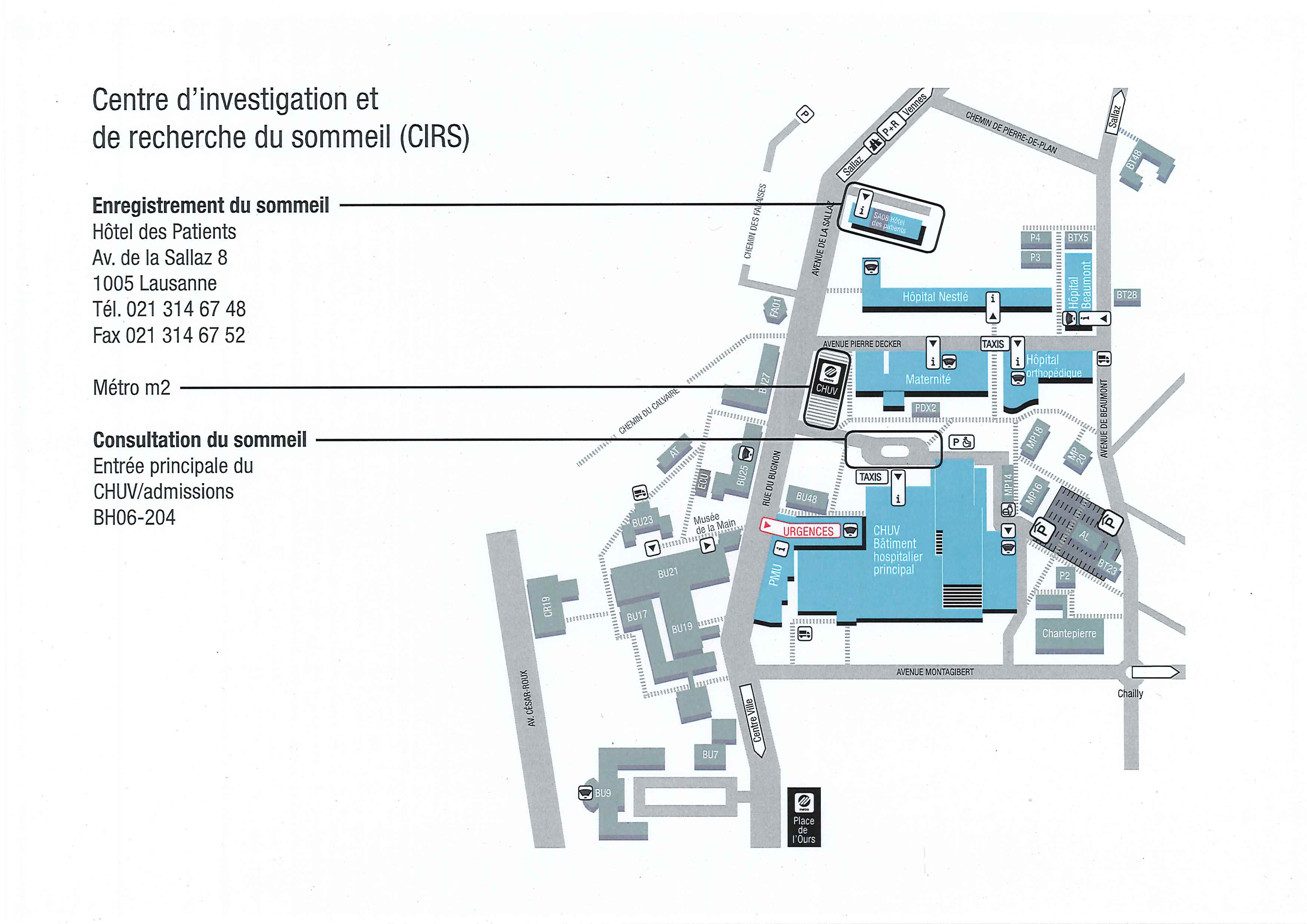 Les examens hospitaliers (polysomnographie, test de latence au sommeil et test de maintien de l'éveil) se déroulent à l'étage consacré à l'Hôtel des Patients.