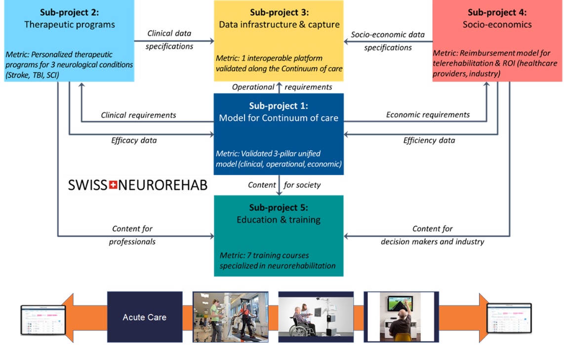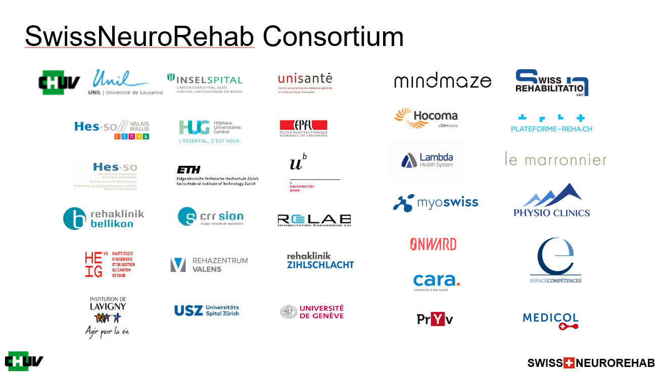 The SwissNeurorehab (https://www.swissneurorehab.ch/) is a 5-year research project financed by Innosuisse and whose aim is to propose a new model of digital neurorehabilitation along the continuum of care in Switzerland. The features of this model include increased personalization and dosage through digital therapeutics and technologies, efficiency in terms of clinical outcomes and economic cost-effectiveness spanning over the whole continuum of care (from hospital to home, included). The project, led by the CHUV, involves over 30 Swiss partners from national research institutes, university hospitals and industry, with a total budget of 11.2M CHF.