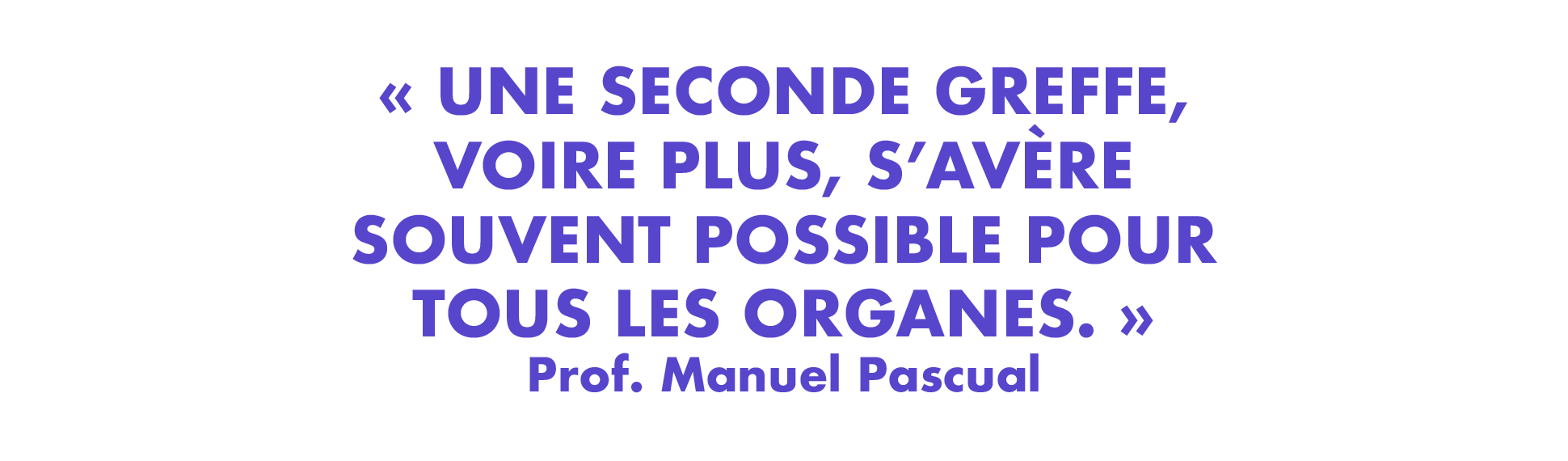 « Un an après une transplantation de rein ou de pancréas, le taux de rejet s’élève à environ 10-20%. Légèrement moins bien que le foie (5-10%), mais mieux que le cœur et les poumons (40-50%) », détaille Manuel Pascual. La durée de vie des greffons varie aussi d’un organe à l’autre : rein et foie peuvent fonctionner 25 à 40 ans, cœur et poumon dépassent rarement les 20 à 25 ans. « Avec les poumons, qui agissent comme un filtre face à l’environnement extérieur, le risque d’infection et de rejet est plus important. Mais une seconde greffe, voire plus, s’avère souvent possible pour tous les organes. »