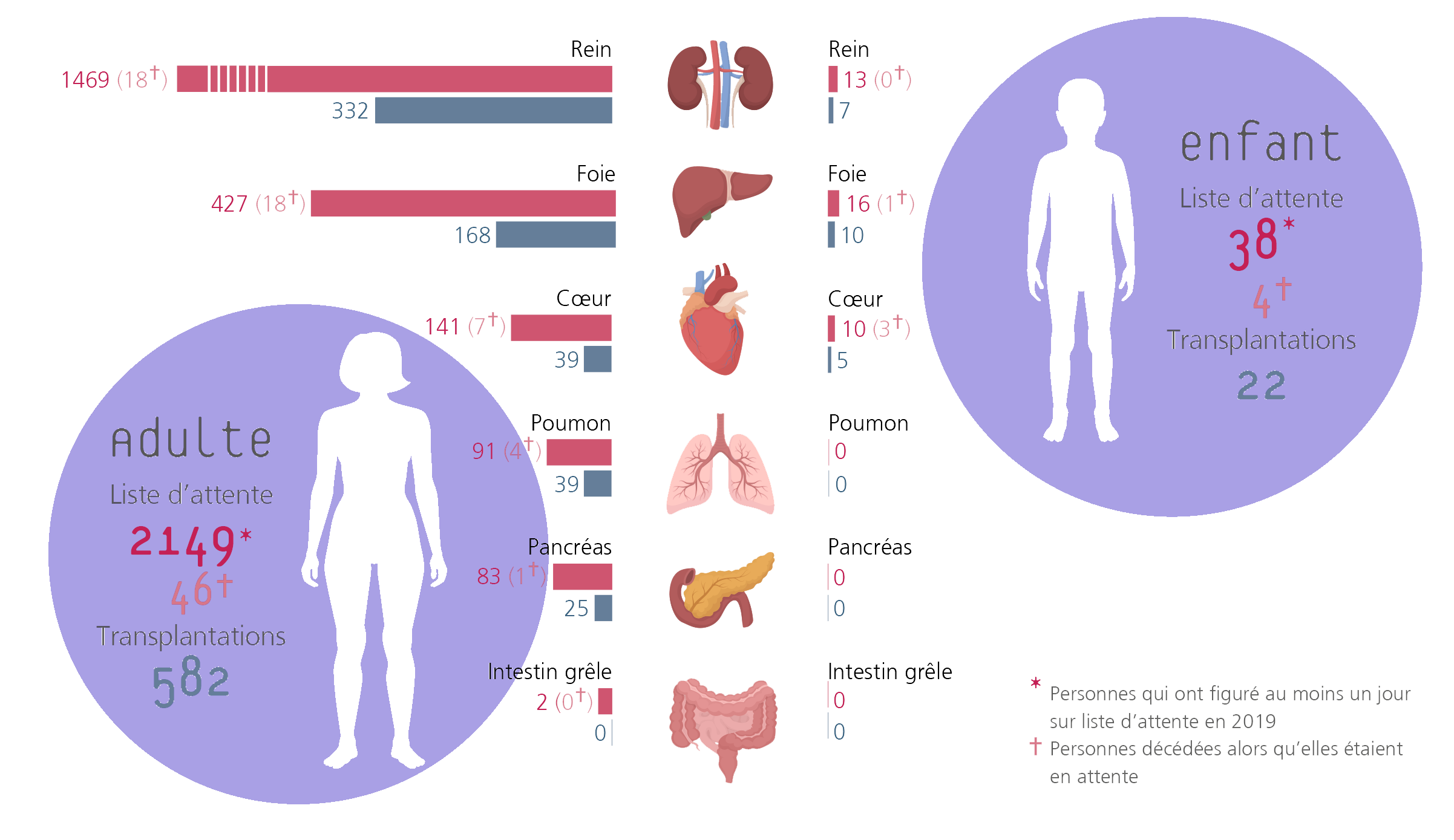 En Suisse, 1415 personnes figuraient sur liste d’attente fin 2019 pour recevoir un ou plusieurs organes. 582 patients avaient bénéficié d’une greffe et 46 étaient décédés, faute d’avoir pu être transplantés à temps. Si l’un des défis majeurs consiste à augmenter le nombre de donneurs, il n’est pas le seul.