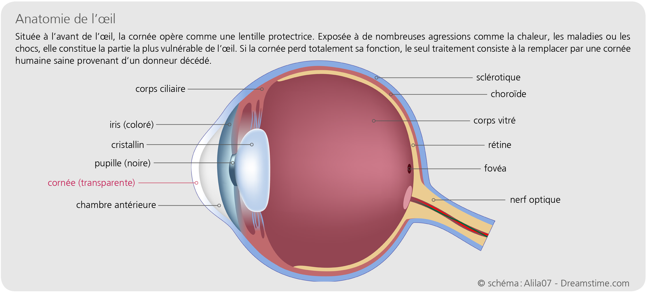 Sous l’effet de maladies (par exemple la dystrophie de Fuchs) ou de traumatismes (coups, brûlures, etc.), la cornée peut perdre en transparence jusqu’à devenir totalement opaque, rendant les patients aveugles. Elle peut également se déformer, notamment en cas de kératocône. Le tissu prend alors progressivement la forme d’un cône. Une transplantation peut dès lors s’avérer nécessaire.